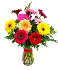 Featuring green button daisies, mini gerbera daisies, carnations, spider mums, and hypericum berries, this lovely flower arrangement spreads energy and enthusiasm. It is paired with lush greenery and it spreads a vibrant expression of passion and vitality. The fragrance of this attractive bouquet is refreshing, while the bold colors and dynamic arrangement in a clear vase add excitement to your anniversary celebration. It's a beautiful present that spreads good vibes and leaves a lasting impression.