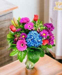 Colors add different flavors to your celebration and when they come in the form of beautiful flowers, the ambiance becomes even more special. Our enchanting birthday flower bouquet “Colors Sing Softly” features a harmonious blend of Gerbera daisies, Asiatic lilies, button daisies, carnations, roses, mini hydrangeas, and snapdragons. It comes paired with lush greenery in a stylish container, making it a superior choice for a birthday present. The vibrant colors and diverse textures on these birthday flowers create a visually captivating arrangement that is guaranteed to impress.