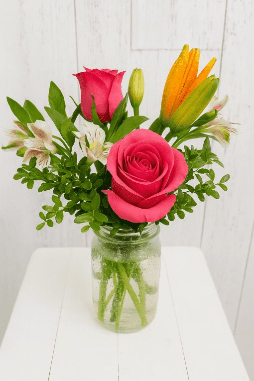 Included: rose, asiatic lily, alstroemeria with greenery in mason jar