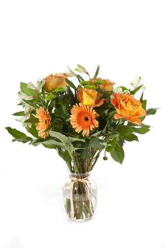 Includes : Clear Vase, Greens, Orange Rose, Orange Gerbera, Green Button Daisy and White Alstroemeria.