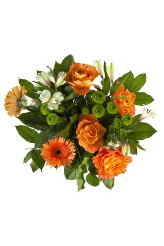 Includes : Greenery, Gerbera, Green Button Daisy, Orange Rose and White Alstroemeria in a beautiful handtied bouquet.