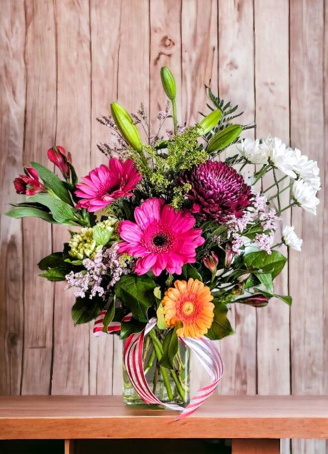 - Arrangement: Gerbera daisy, Asiatic lily, alstroemeria, chrysanthemum daisy, mini hydrangea with greenery in a clear vase.