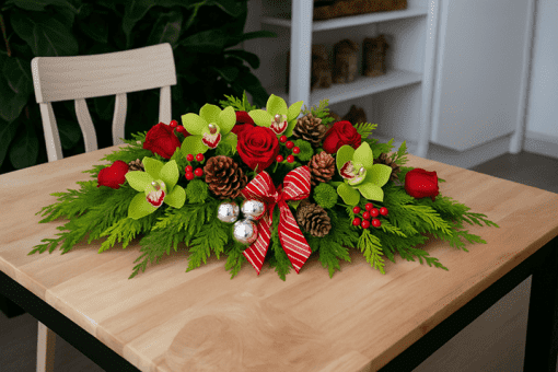 Included: 6 stems red rose, 4 mini cymbidium orchid blooms, 6 stems red hypericum berry, 2 stems green button daisy, Christmas greenery and decorations in a centerpiece.