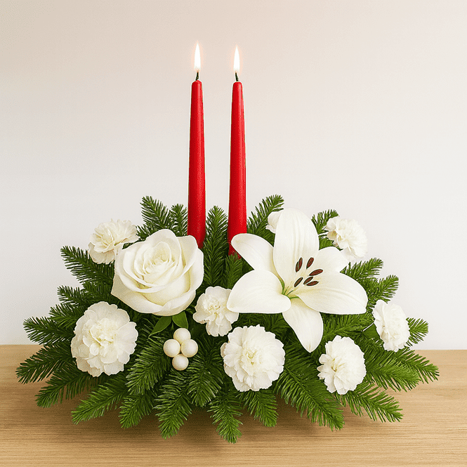Included: 8 stems white carnation, 1 stem white rose, 1 stem Asiatic lily, 2 candles, Christmas greenery in a centerpiece.