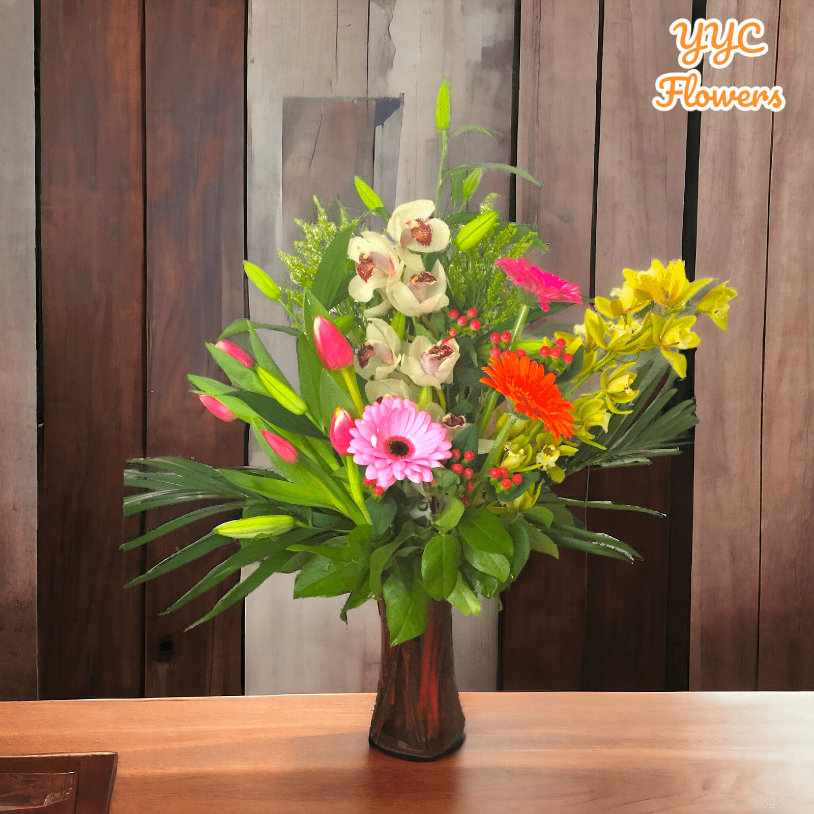 - Colorful Flower Mix: The bouquet has three lovely shades of Mini cymbidium orchid, Gerbera daisies, white oriental lily, pink tulip, and pink hypericum berries, making a bright combination and lively display.