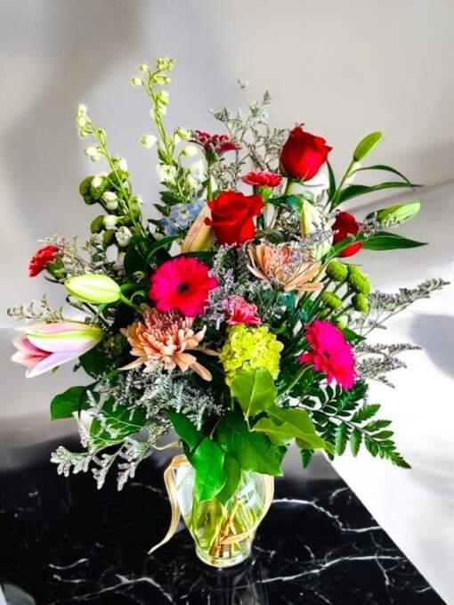 - Romantic and Lush Flower Selection: This bouquet features an enchanting mix of fresh flowers, including deep red roses symbolizing love, delicate larkspur for an air of elegance, soft-hued spider mums representing longevity, and bright mini gerbera daisies bringing joy. Complemented by the gentle charm of carnations, alstroemeria, and Asiatic lilies, this arrangement radiates warmth and affection.