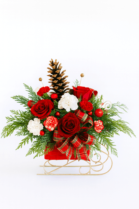 Included: 3 stems red rose, 2 stems white rose, 4 stems red carnation, Christmas greenery and decorations in Santa’s Sleigh