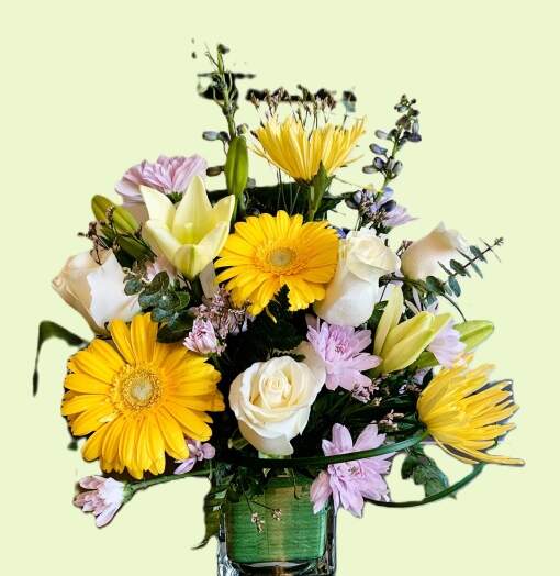 - Arrangement: Chrysanthemum daisy, rose, Asiatic lily, gerbera daisy, spider mum and larkspur paired with lush greenery in a container / vase.
