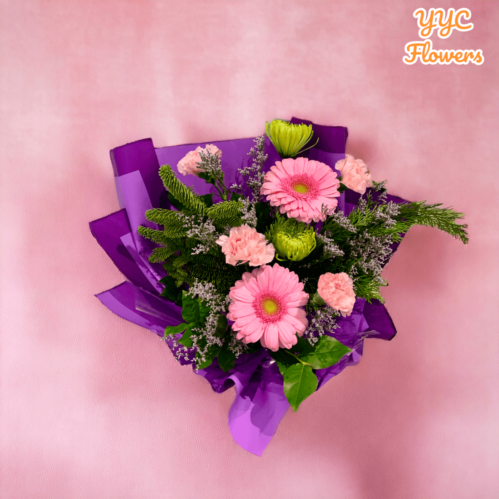 - Pinkish Bunch: Pink Gerbera daisies, light pink carnations, and green spider mum are the highlights of this lovely bouquet. Purple statice is also included to give it fullness and offer a bright and varied look.