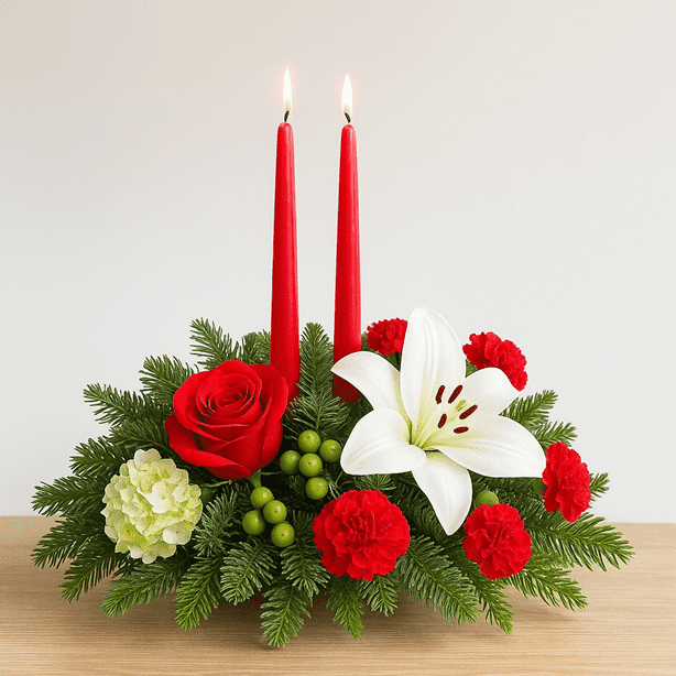 Included: 1 stem red rose, 1 stem white Asiatic lily, 5 stems red carnation, 1 stem mini green hydrangea, 2 stems green hypericum berry, 2 red candles, Christmas greenery in a centerpiece.