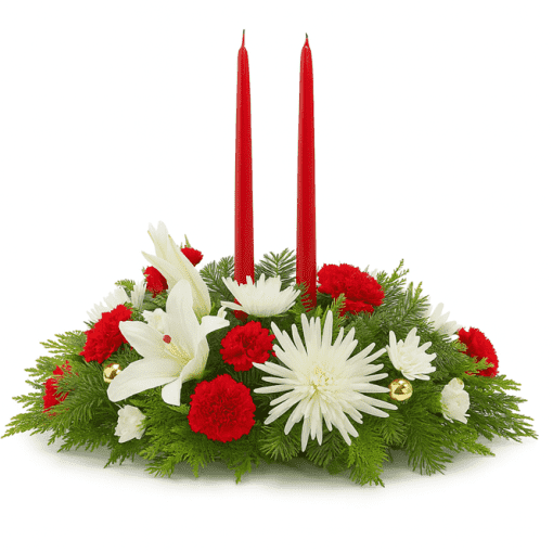 Included: 1 stem white Asiatic lily, 3 stems white spider mum, 1 stem white chrysanthemum daisy, 7 stems red carnation, 4 stems white carnation, 2 red candles, Christmas greenery and decorations in a centerpiece.