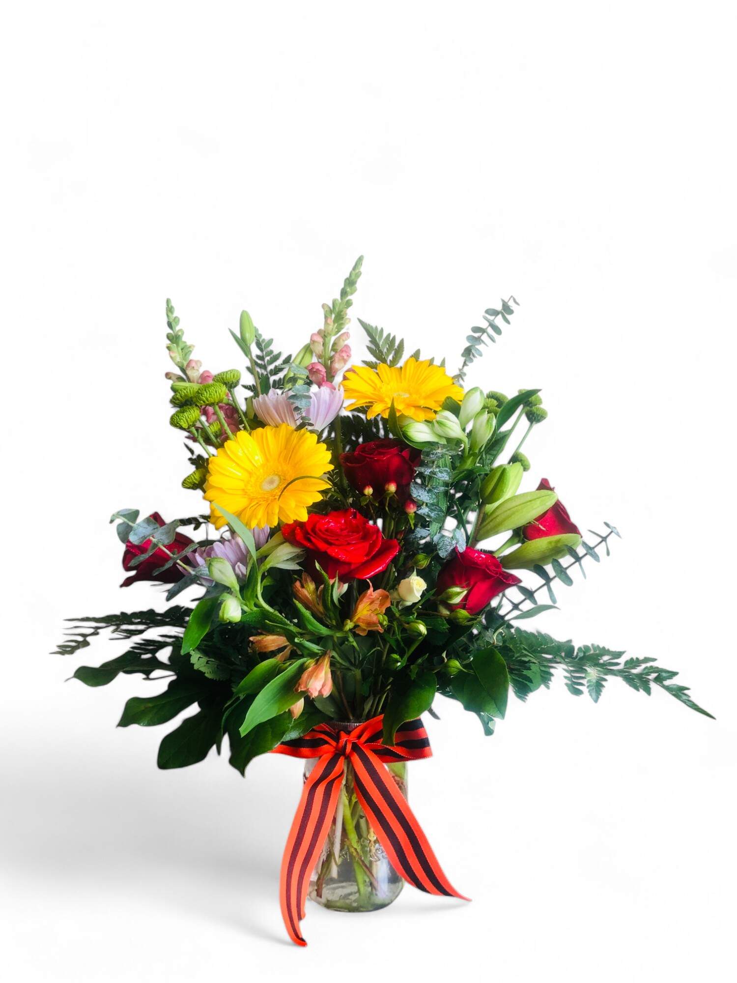 - Arrangement: gerbera daisy, rose, Asiatic lily, green button daisy, spider mum, alstroemeria , snap dragons and greenery