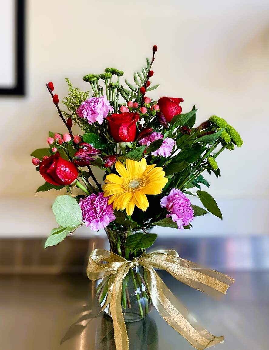 - Arrangement: Button daisy, carnation, rose, alstroemeria, hypericum berry, red willow, gerbera daisy paired with lush greenery in a vase.