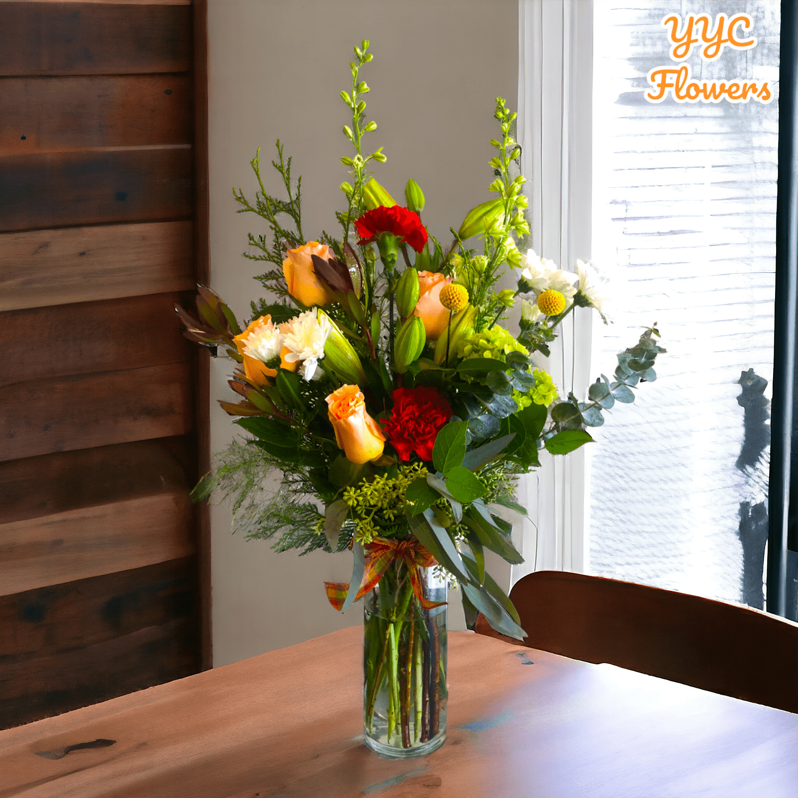 - Sunny Flower Blend: This floral display brings together orange/peach roses, red carnations, white chrysanthemums, white asiatic lily, and white larkspurs. It’s a bright mix that shows love and happiness.
