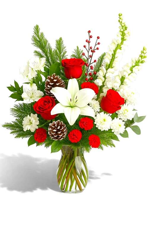 Included: 3 stems red rose, 2 stems white snapdragon, 5 stems red carnation, 1 stem white alstroemeria, 1 stem white chrysanthemum daisy, 1 stem white Asiatic lily, Christmas greenery and decorations in a clear vase.