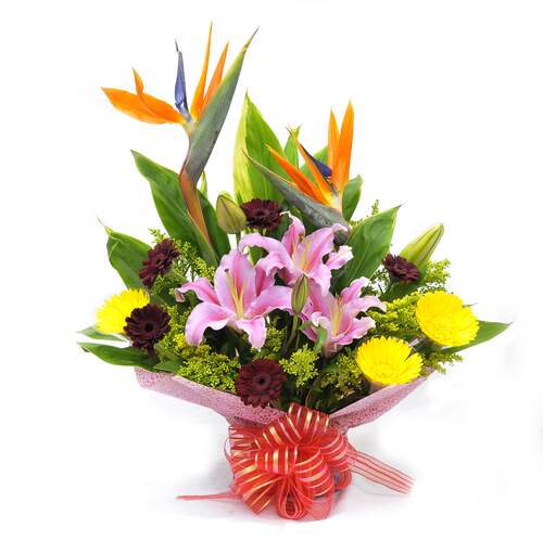 Let them know how much you care. It’s the perfect way to show you think about them always and forever. Includes : Greens, Bird Paradise, Pink Oriental Lily, Gerbera, Solidago.