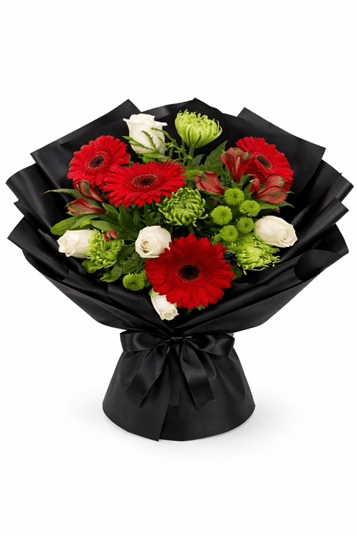 - Vibrant Flower Assortment: Red gerbera daisies take center stage, while white roses add elegance and green button chrysanthemums bring texture and contrast.