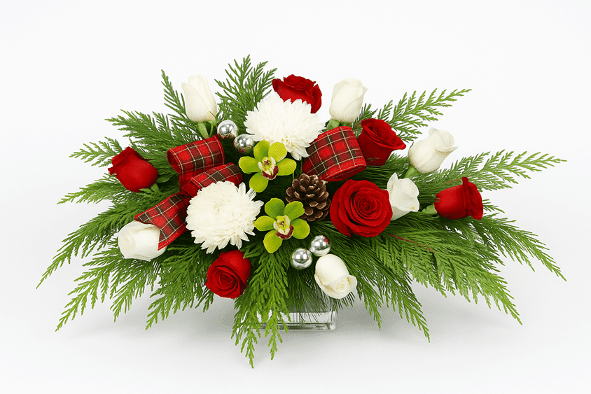 Included: 6 stems white rose, 6 stems red rose, 2 stems white cremon, 2 mini cymbidium orchid blooms, Christmas greenery and decorations in a clear vase.