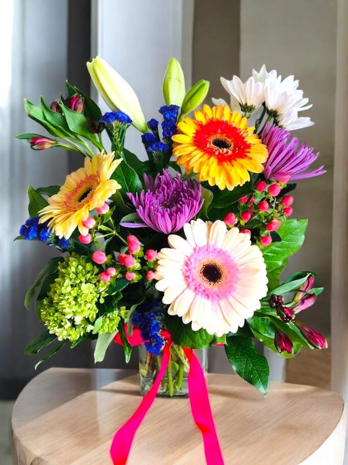 Includes : Clear Vase, Greens, Gerbera, Daisy, Asistic Lily, Alstroemeria, Spider Mum and Green Hypericum Berry.