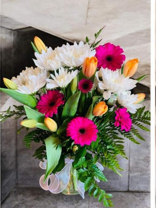 SKU: YYC54 Categories: Admin's Week, Anniversary, Baby Shower & New Baby, Birthday, Congratulations, Get Well Soon, Sympathy Tags: chrysanthemmum, gerbera, gerbera daisies, tulip