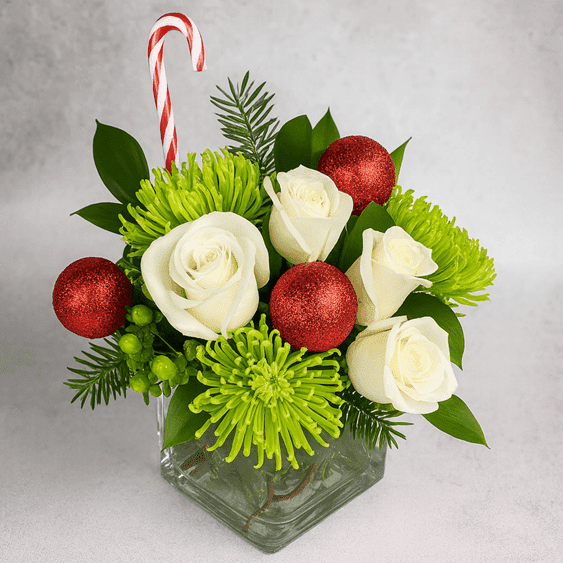 - Holiday Accents & Fillers: Accentuated with holiday ornaments and sprigs of lush evergreens, the bouquet is given a festive touch with the addition of glittery baubles and candy-cane sticks. The fresh green foliage and winter accents add depth, enhancing the bouquet’s overall texture and festive charm.